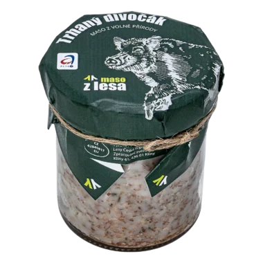Maso z divočáka 80%, vepřové sádlo 20%, kuchyňská sůl, směs koření, tymián, bílé víno.
